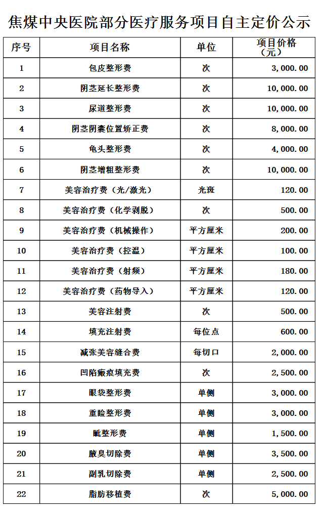 焦煤中央医院部分医疗服务项目自主定价公示