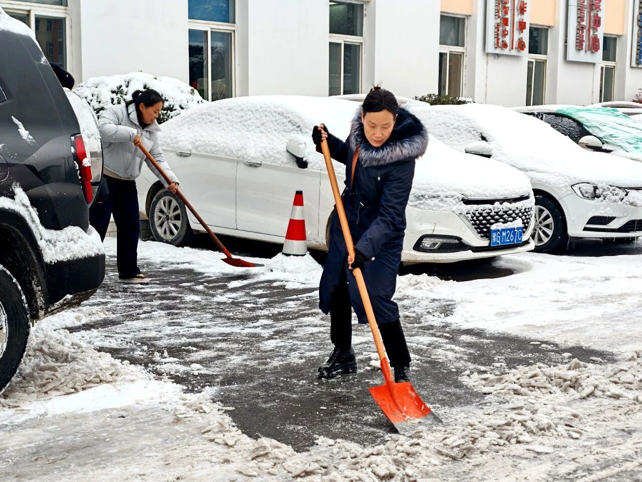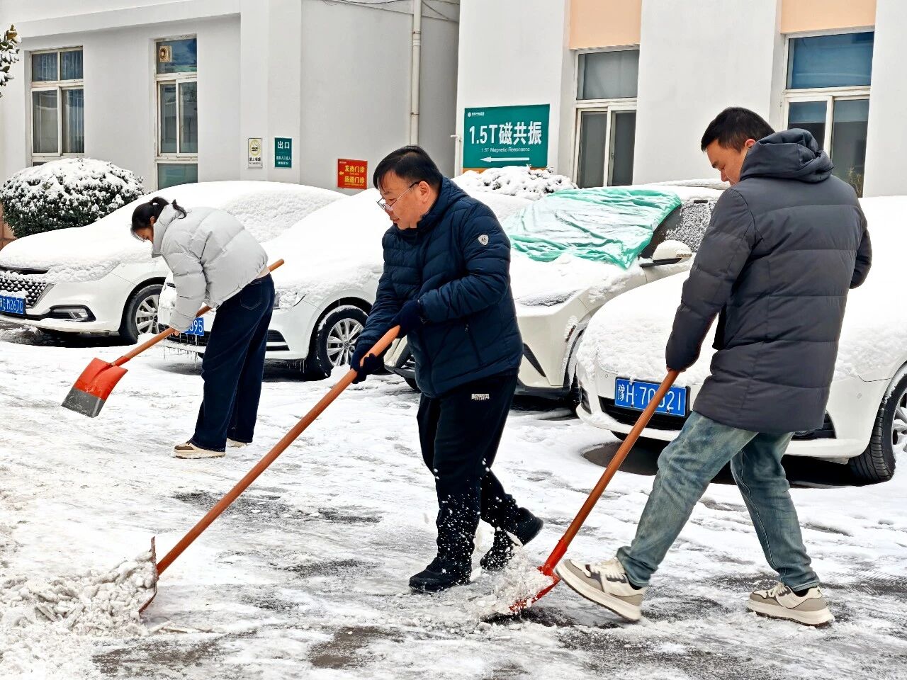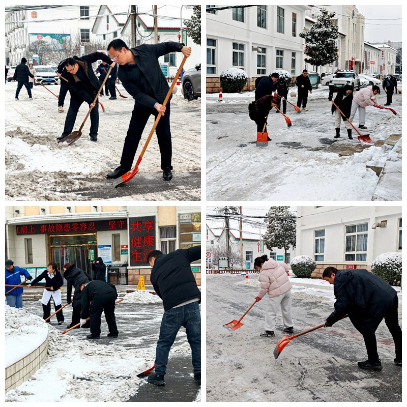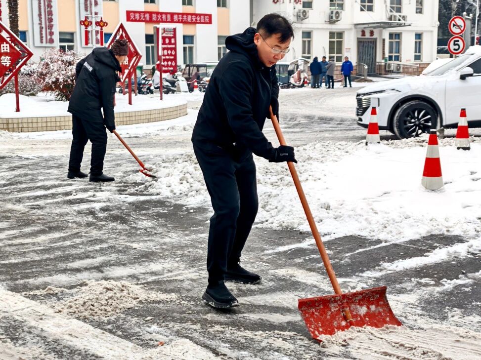 冒着凛冽的寒风,大家迅速集结、现场分工,有序拿起铁锹、扫帚、雪铲等工具,齐心协力、配合默契,有的弯腰用铁锹撬起结冰的路面,有的手持扫帚清扫残余积雪,合力将成堆的积雪清运至指定区域,确保不留一处死角、不存一处隐患。经过近两个小时的奋力协作,院区主干道积雪被基本清除,为前来就诊的患者开辟出了一条“暖心通道”。同时,在坡道等易滑区域铺设防滑地毯,方便患者及家属清理脚底积雪,最大程度降低滑倒风险。